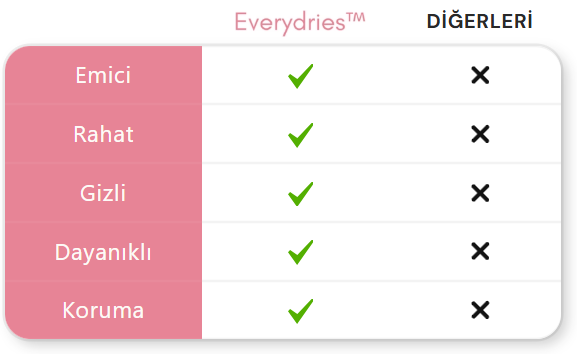 EveryDryies olarak inkontinansın hayatınızı sınırlamaması gerektiğine inanıyoruz. Bu nedenle, kıyafetlerinizin altında tamamen görünmeyen, ancak %100 sızdırmaz olma avantajına sahip yumuşak, rahat iç çamaşırları üretiyoruz.